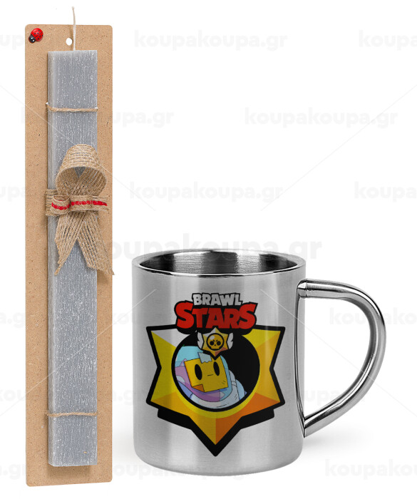 Brawl Stars Sprout, Easter Set, metallic thermal cup (300ml) & Easter aromatic flat candle (30cm) (GRAY)