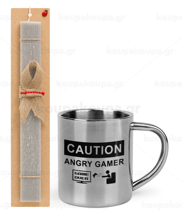 Caution, angry gamer!, Easter Set, metallic thermal cup (300ml) & Easter aromatic flat candle (30cm) (GRAY)