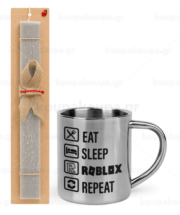 Eat, Sleep, Roblox, Repeat, Easter Set, metallic thermal cup (300ml) & Easter aromatic flat candle (30cm) (GRAY)