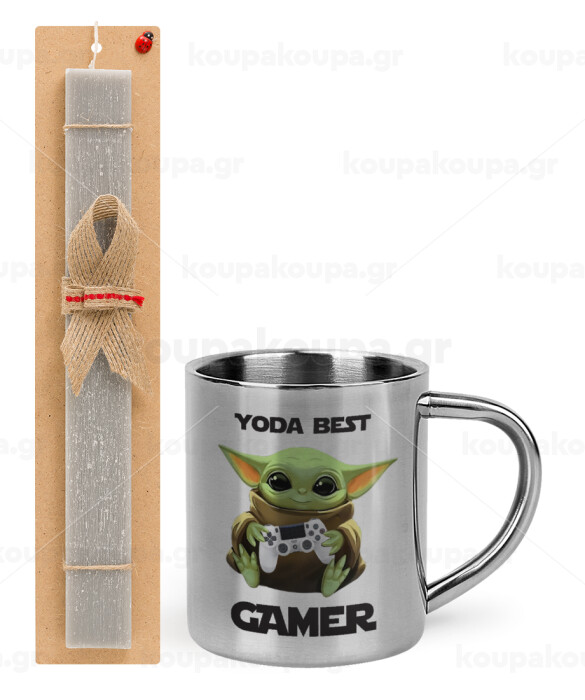 Yoda Best Gamer, Easter Set, metallic thermal cup (300ml) & Easter aromatic flat candle (30cm) (GRAY)