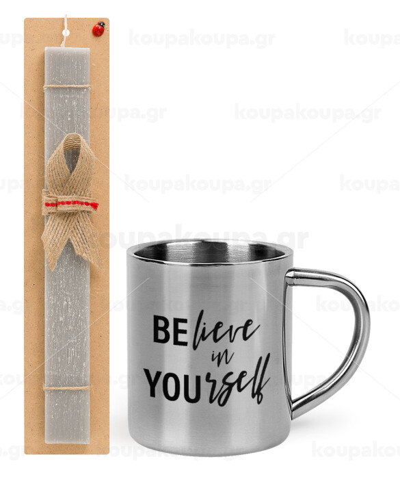 Believe in your self, Easter Set, metallic thermal cup (300ml) & Easter aromatic flat candle (30cm) (GRAY)