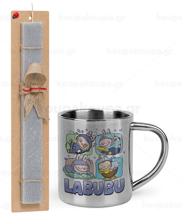 Labubu, Easter Set, metallic thermal cup (300ml) & Easter aromatic flat candle (30cm) (GRAY)