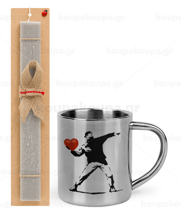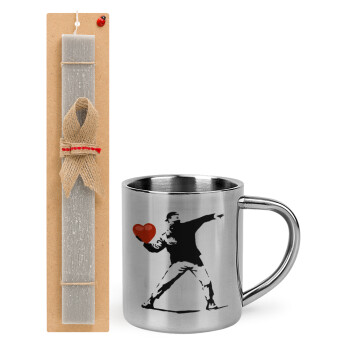 Banksy (The heart thrower), Easter Set, metallic thermal cup (300ml) & Easter aromatic flat candle (30cm) (GRAY)