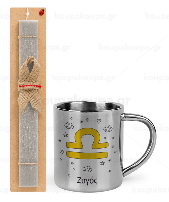 Ζώδια Ζυγός, Easter Set, metallic thermal cup (300ml) & Easter aromatic flat candle (30cm) (GRAY)