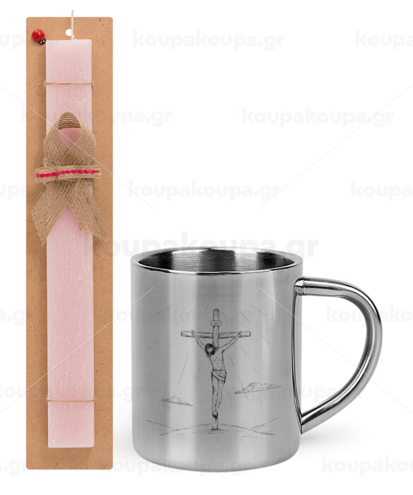 Jesus Christ , Easter Set, metallic thermal cup (300ml) & aromatic flat Easter candle (30cm) (PINK)