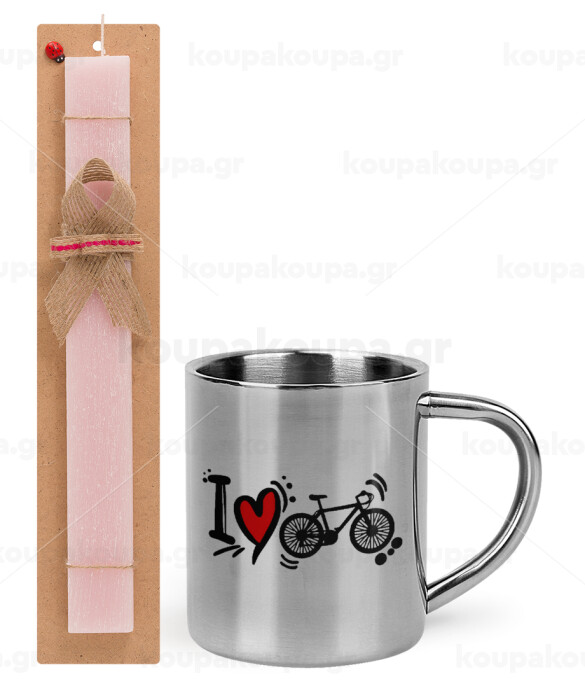 I love my bike, Easter Set, metallic thermal cup (300ml) & aromatic flat Easter candle (30cm) (PINK)