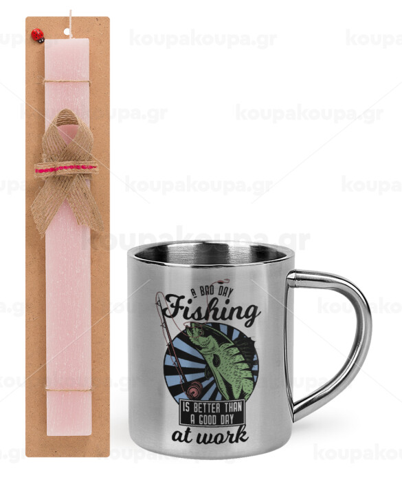 A bad day FISHING is better than a good day at work, Easter Set, metallic thermal cup (300ml) & aromatic flat Easter candle (30cm) (PINK)