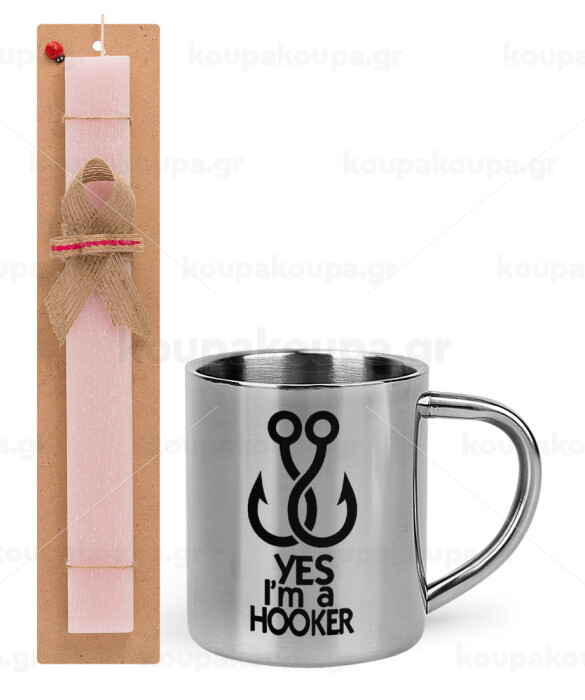 Yes i am Hooker, Easter Set, metallic thermal cup (300ml) & aromatic flat Easter candle (30cm) (PINK)
