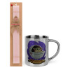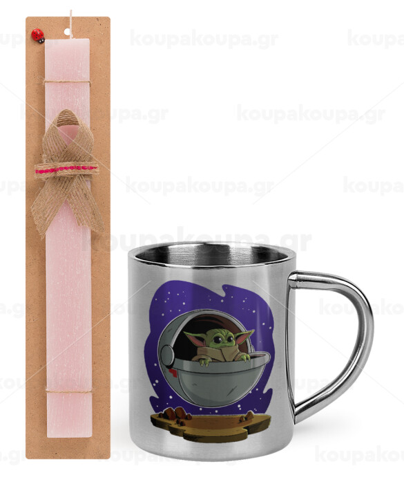 Baby Yoda mandalorian, Easter Set, metallic thermal cup (300ml) & aromatic flat Easter candle (30cm) (PINK)