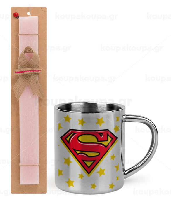 Superman Blue, Easter Set, metallic thermal cup (300ml) & aromatic flat Easter candle (30cm) (PINK)