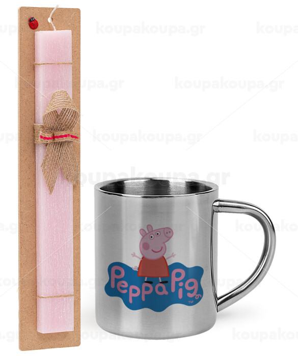 Πέππα το γουρουνάκι μπλε με όνομα, Easter Set, metallic thermal cup (300ml) & aromatic flat Easter candle (30cm) (PINK)