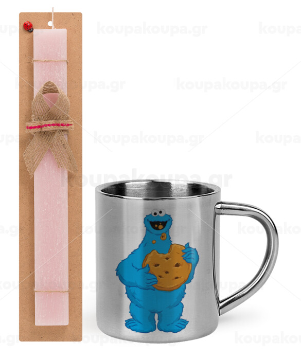 Cookie Monster, Easter Set, metallic thermal cup (300ml) & aromatic flat Easter candle (30cm) (PINK)