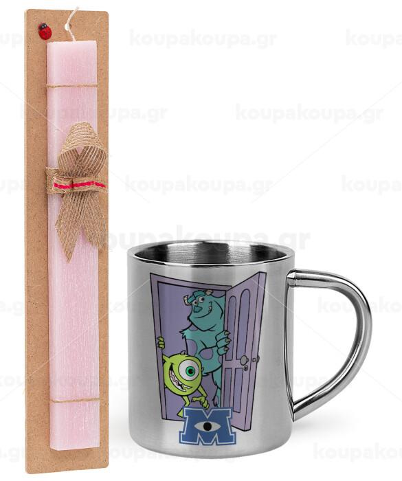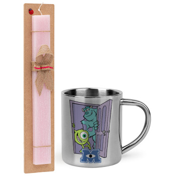 Monster inc, Easter Set, metallic thermal cup (300ml) & aromatic flat Easter candle (30cm) (PINK)