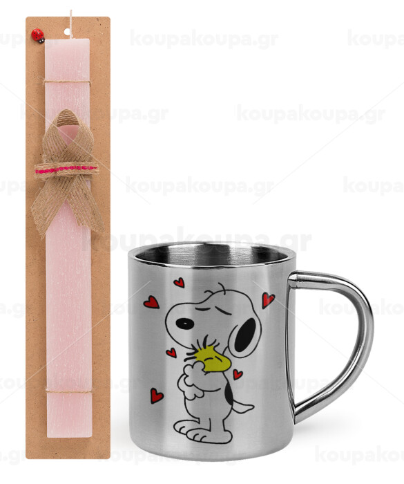 Snoopy Love, Easter Set, metallic thermal cup (300ml) & aromatic flat Easter candle (30cm) (PINK)