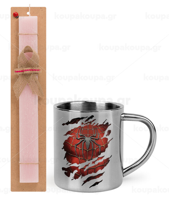 Spiderman cracked, Easter Set, metallic thermal cup (300ml) & aromatic flat Easter candle (30cm) (PINK)