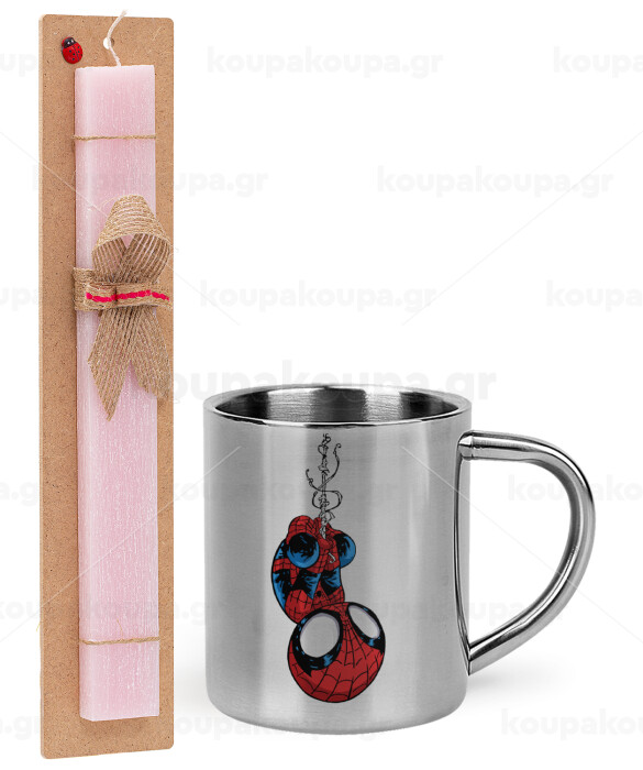 Spiderman upside down, Easter Set, metallic thermal cup (300ml) & aromatic flat Easter candle (30cm) (PINK)