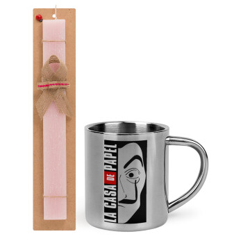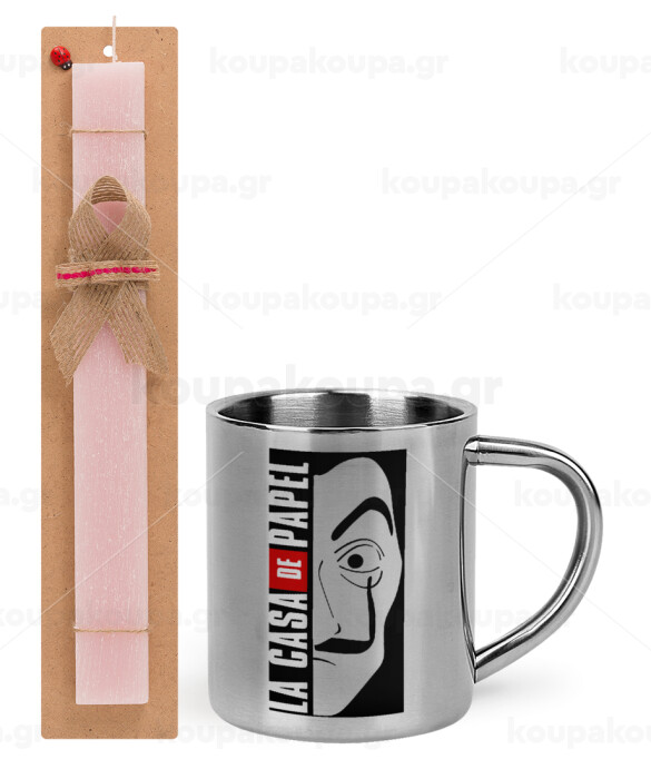 La casa de papel vertical, Easter Set, metallic thermal cup (300ml) & aromatic flat Easter candle (30cm) (PINK)