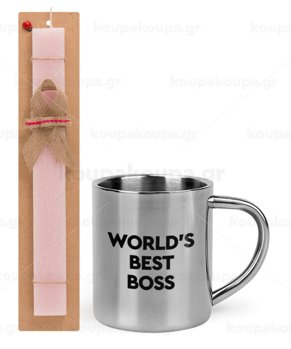 World's best boss, Easter Set, metallic thermal cup (300ml) & aromatic flat Easter candle (30cm) (PINK)