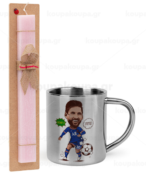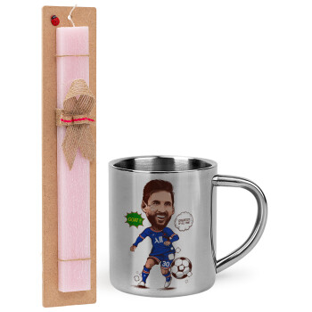 Lionel Messi drawing, Easter Set, metallic thermal cup (300ml) & aromatic flat Easter candle (30cm) (PINK)