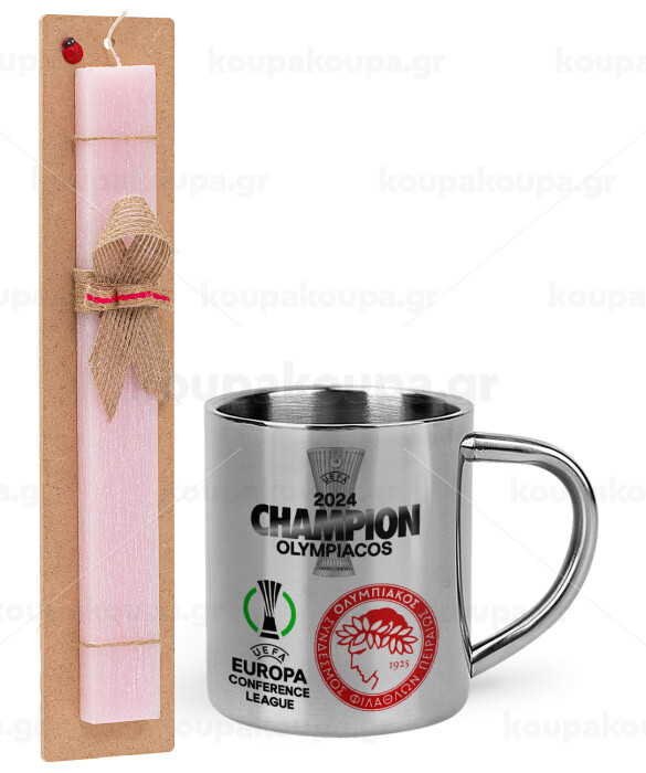 Olympiacos UEFA Europa Conference League Champion 2024, Easter Set, metallic thermal cup (300ml) & aromatic flat Easter candle (30cm) (PINK)