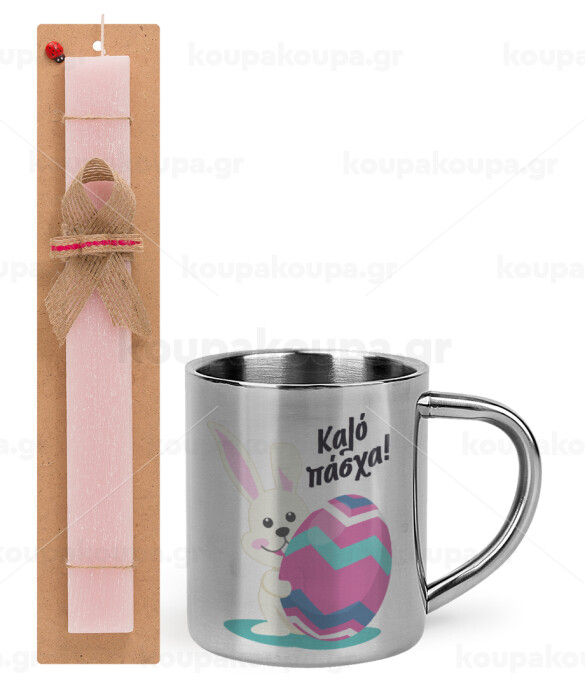 Καλό πάσχα, Easter Set, metallic thermal cup (300ml) & aromatic flat Easter candle (30cm) (PINK)