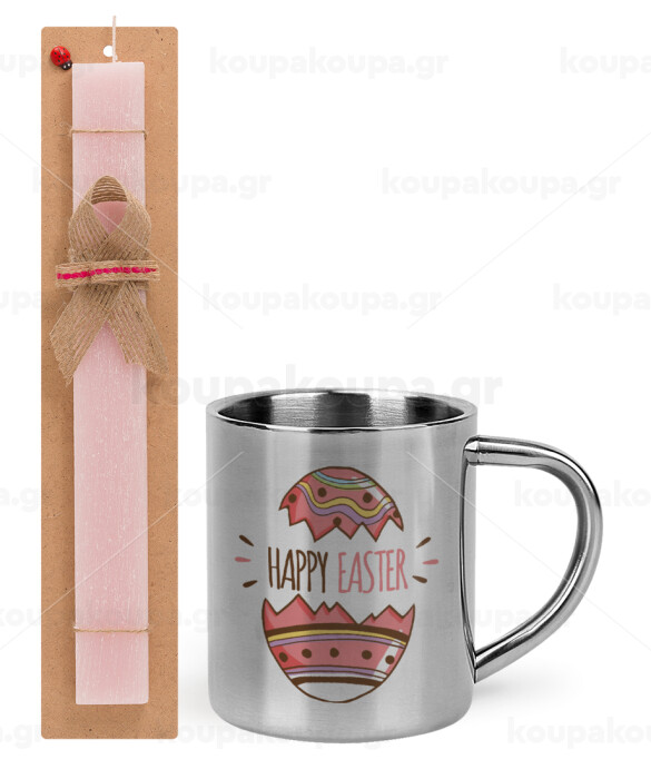 Happy easter egg, Easter Set, metallic thermal cup (300ml) & aromatic flat Easter candle (30cm) (PINK)