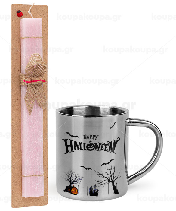 Happy Halloween cemetery, Easter Set, metallic thermal cup (300ml) & aromatic flat Easter candle (30cm) (PINK)