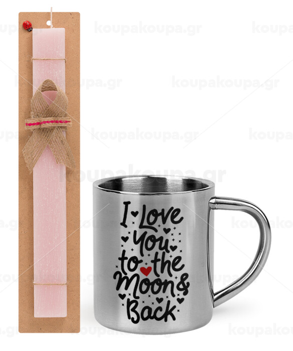 I love you to the moon and back with hearts, Easter Set, metallic thermal cup (300ml) & aromatic flat Easter candle (30cm) (PINK)