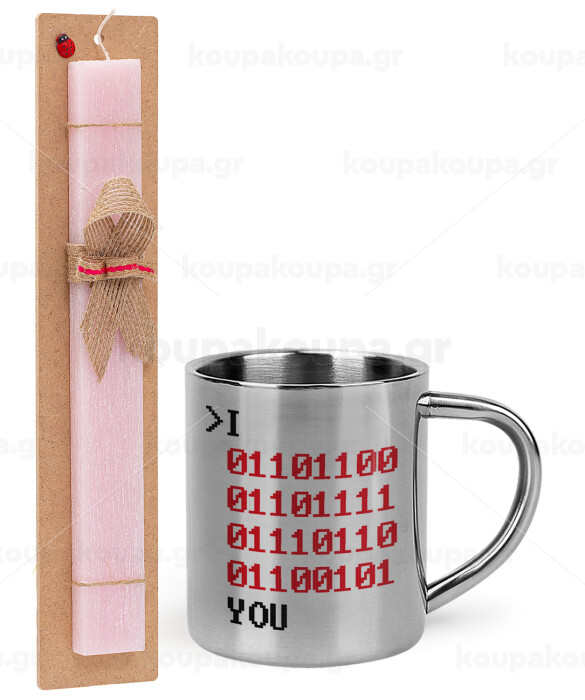 I .... YOU, binary secret MSG, Easter Set, metallic thermal cup (300ml) & aromatic flat Easter candle (30cm) (PINK)