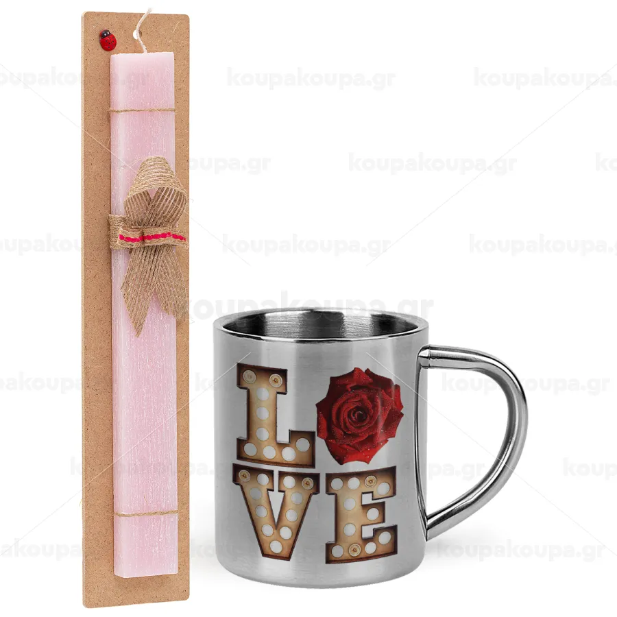 Love lights and roses, Easter Set, metallic thermal cup (300ml) & aromatic flat Easter candle (30cm) (PINK)