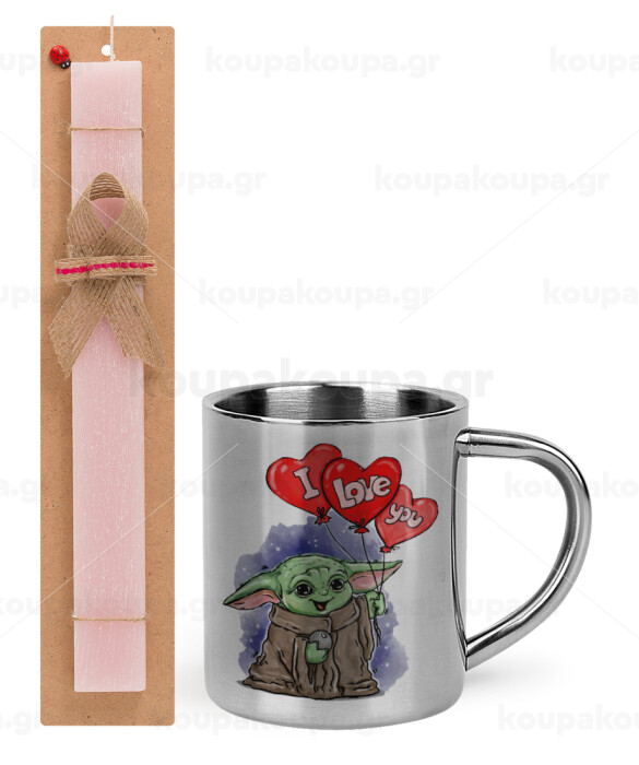 Yoda, i love you, Easter Set, metallic thermal cup (300ml) & aromatic flat Easter candle (30cm) (PINK)