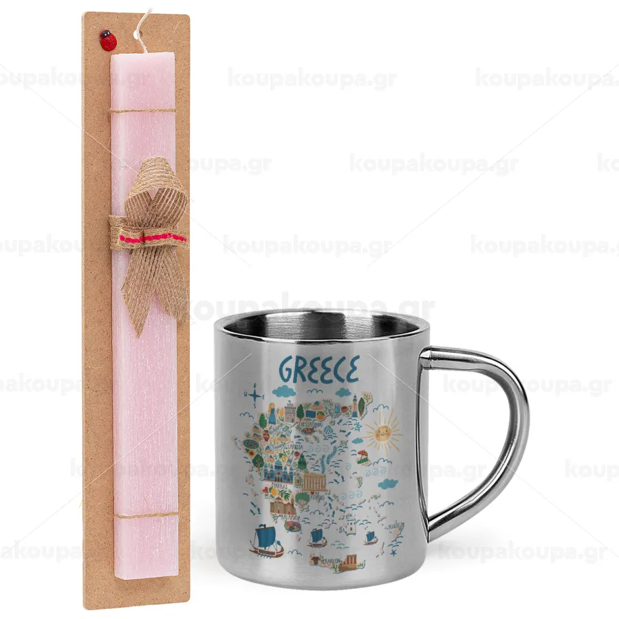 Greek map, Easter Set, metallic thermal cup (300ml) & aromatic flat Easter candle (30cm) (PINK)