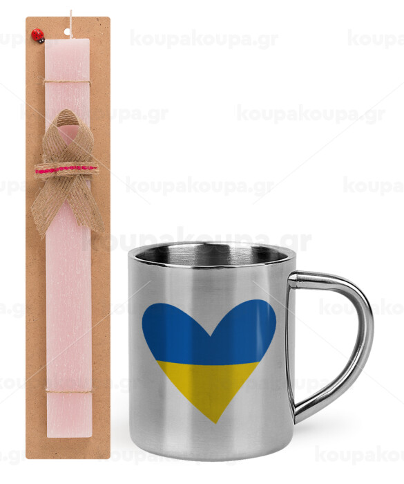 UKRAINE heart, Easter Set, metallic thermal cup (300ml) & aromatic flat Easter candle (30cm) (PINK)