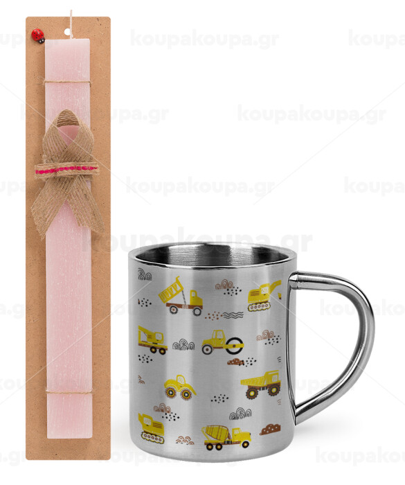 Car construction, Easter Set, metallic thermal cup (300ml) & aromatic flat Easter candle (30cm) (PINK)