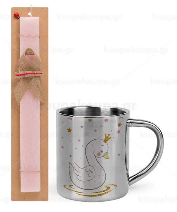 Crowned swan, Easter Set, metallic thermal cup (300ml) & aromatic flat Easter candle (30cm) (PINK)