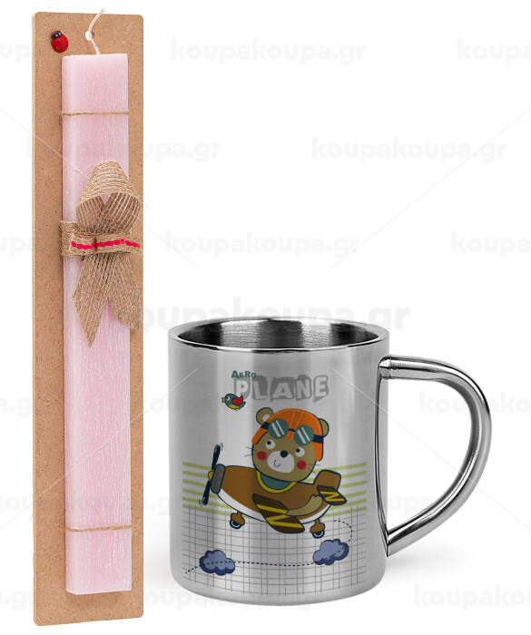 Kids Plane, Easter Set, metallic thermal cup (300ml) & aromatic flat Easter candle (30cm) (PINK)