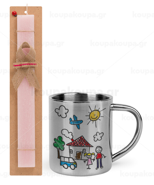 Children's drawing, Easter Set, metallic thermal cup (300ml) & aromatic flat Easter candle (30cm) (PINK)