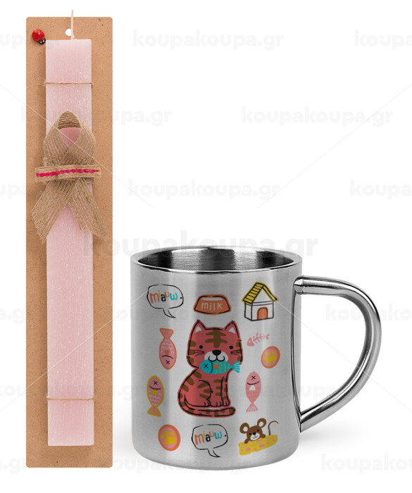 Cats and Fishes, Easter Set, metallic thermal cup (300ml) & aromatic flat Easter candle (30cm) (PINK)