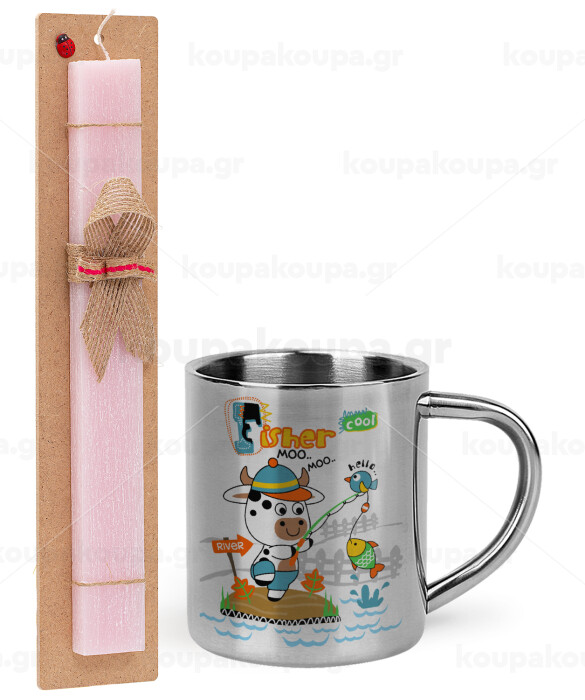 Kids Fisherman, Easter Set, metallic thermal cup (300ml) & aromatic flat Easter candle (30cm) (PINK)
