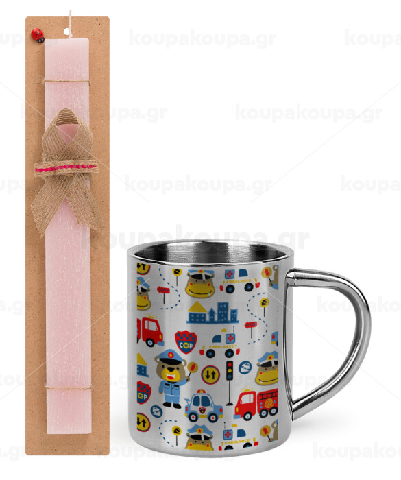 Rescue team cartoon, Easter Set, metallic thermal cup (300ml) & aromatic flat Easter candle (30cm) (PINK)