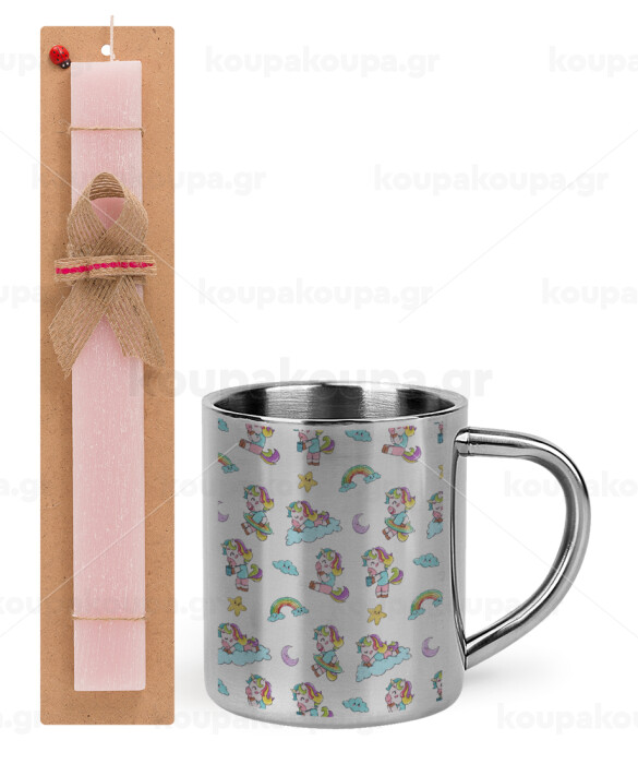 Unicorn pattern, Easter Set, metallic thermal cup (300ml) & aromatic flat Easter candle (30cm) (PINK)