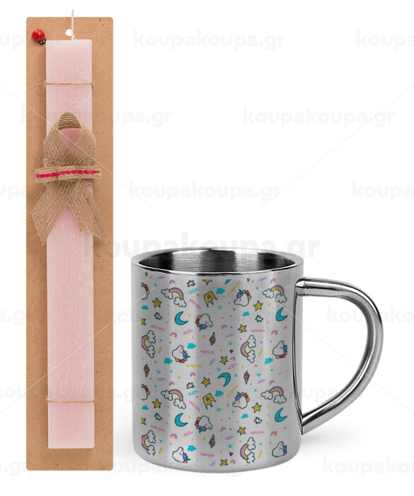 Unicorn pattern white, Easter Set, metallic thermal cup (300ml) & aromatic flat Easter candle (30cm) (PINK)