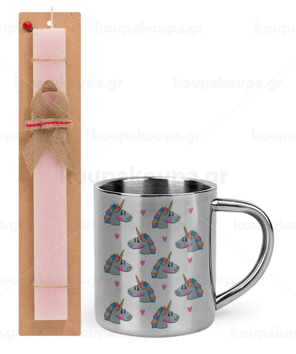 Unicorn, Easter Set, metallic thermal cup (300ml) & aromatic flat Easter candle (30cm) (PINK)