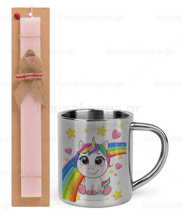 Unicorn baby με όνομα, Easter Set, metallic thermal cup (300ml) & aromatic flat Easter candle (30cm) (PINK)
