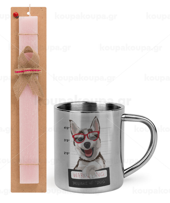 Warning, beware of Dog, Easter Set, metallic thermal cup (300ml) & aromatic flat Easter candle (30cm) (PINK)