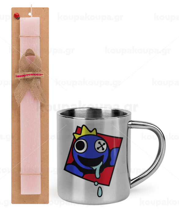 Blue, Rainbow friends, Easter Set, metallic thermal cup (300ml) & aromatic flat Easter candle (30cm) (PINK)