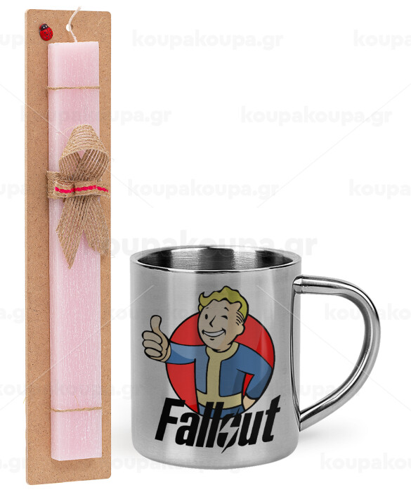 Fallout Vault Boy, Easter Set, metallic thermal cup (300ml) & aromatic flat Easter candle (30cm) (PINK)