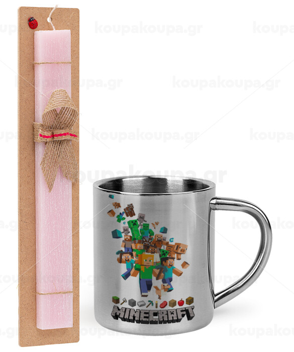 Minecraft adventure, Easter Set, metallic thermal cup (300ml) & aromatic flat Easter candle (30cm) (PINK)