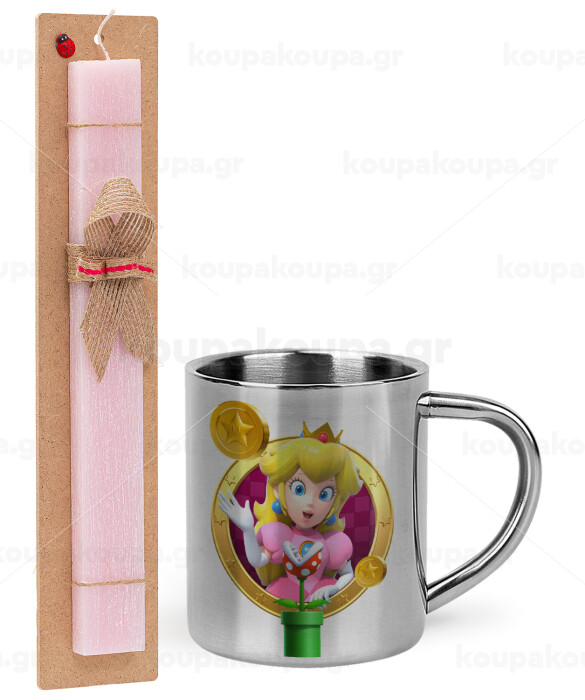 Princess Peach Toadstool, Easter Set, metallic thermal cup (300ml) & aromatic flat Easter candle (30cm) (PINK)