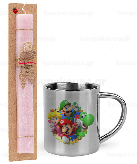 Super mario and Friends, Easter Set, metallic thermal cup (300ml) & aromatic flat Easter candle (30cm) (PINK)
